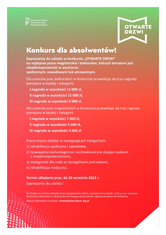 Ogólnopolski Konkurs „OTWARTE DRZWI”, na najlepsze prace magisterskie i doktorskie, których tematem jest niepełnosprawność w wymiarze: społecznym, zawodowym lub zdrowotnym organizowanym przez Państwowy Fundusz Rehabilitacji Osób Niepełnosprawnych.