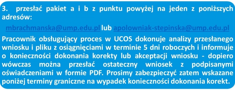 - do 9 października (do godz. 23:59) – przesyłanie poprawionych wniosków w formacie WORD oraz w formie skanu z własnoręcznie podpisanymi oświadczeniami w punktach 1-3 w formacie PDF przez studentów do UCOS